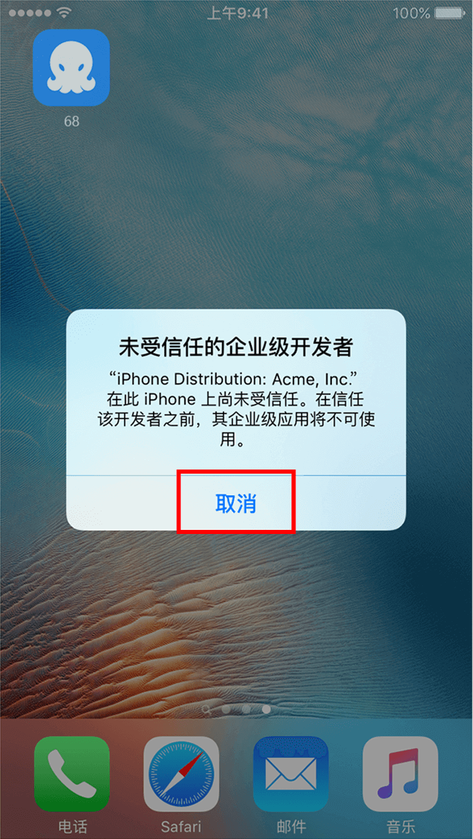 1、首次打開手動安裝的企業級應用時,會看到一個通知,提示該應用的開發者在設備上不受信任。您可以關閉此信息,但您無法打開該應用。
