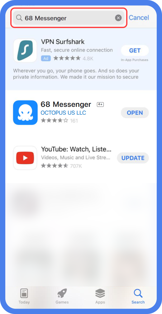 点击更改之后会自动跳转到AppStore,在搜索框内搜索68应用,能搜索到,说明地区已经更改成功了。